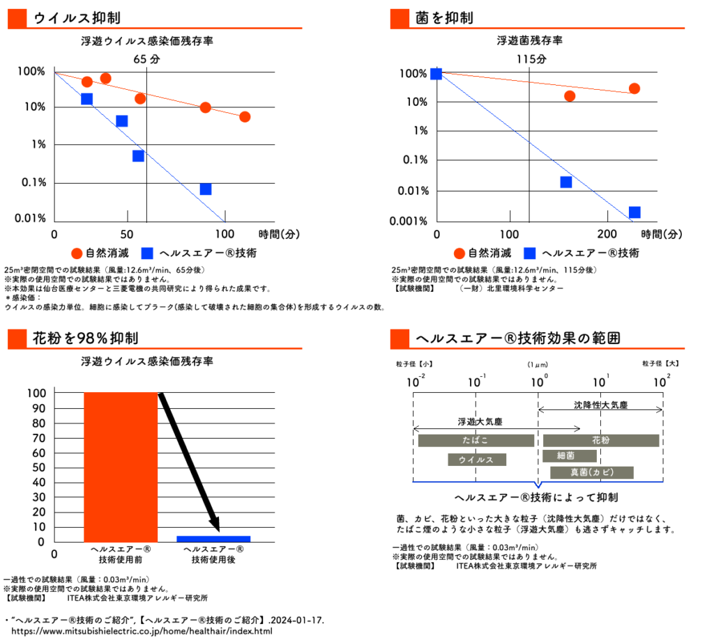 - ※5 ”三菱電機“,【ヘルスエアー技術で浮遊する新型コロナウイルス(SARS-CoV-2)の低減効果を確認】,2024-01-17. https://kaden.watch.impress.co.jp/docs/news/1318260.html